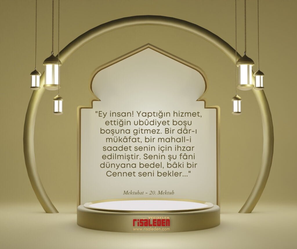 Mektubat Ey insan! Ey insan! Yaptığın hizmet, ettiğin ubûdiyet boşu boşuna gitmez. risaleden 26/01/2023 210 0Bir dâr-ı mükâfat, bir mahall-i saadet senin için ihzar edilmiştir. Senin şu fâni dünyana bedel, bâki bir Cennet seni bekler… Tags: MektubatContinue ReadingPrevious: Eğer rahmet-i Rahmân istersen,Next: En bahtiyar odur kiBir cevap yazın Cevabı iptal etE-posta hesabınız yayımlanmayacak. Gerekli alanlar * ile işaretlenmişlerdirYorum *İsim * E-posta * İnternet sitesi Bir dahaki sefere yorum yaptığımda kullanılmak üzere adımı, e-posta adresimi ve web site adresimi bu tarayıcıya kaydet.
